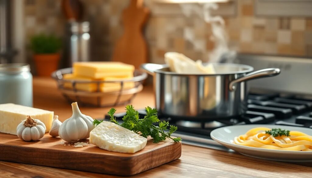 All the recipes you need to try- Prepare the ingredients: butter, garlic, heavy cream, and Parmesan cheese.