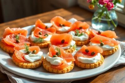 Smoked salmon and cream cheese bites are small, savory appetizers that typically consist of smoked salmon layered with cream cheese, often served on a base such as crackers or bread. These bites are a fantastic option for parties, offering a sophisticated touch without requiring extensive culinary skills.