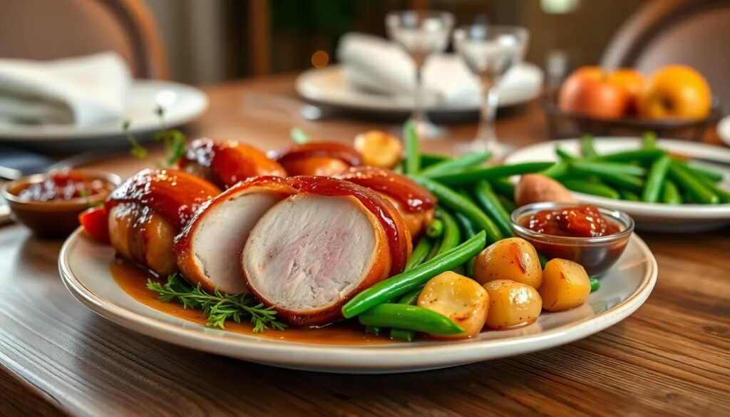 These pairings not only enhance the meal's presentation but also balance the rich flavors of the pork and bacon, creating a satisfying dining experience.